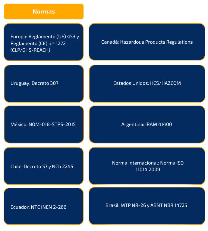 Ofrecemos servicios de elaboración, revisión, traducción y adecuación de fichas de seguridad conforme a las normas y legislaciones vigentes, abarcando las etapas de producción, manipulación, almacenamiento, transporte y eliminación de productos químicos.